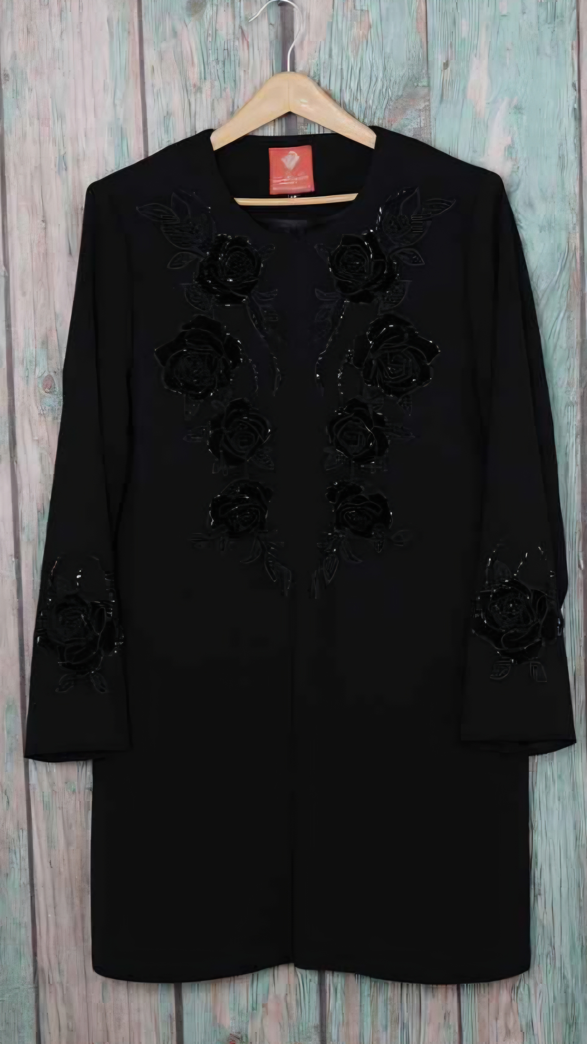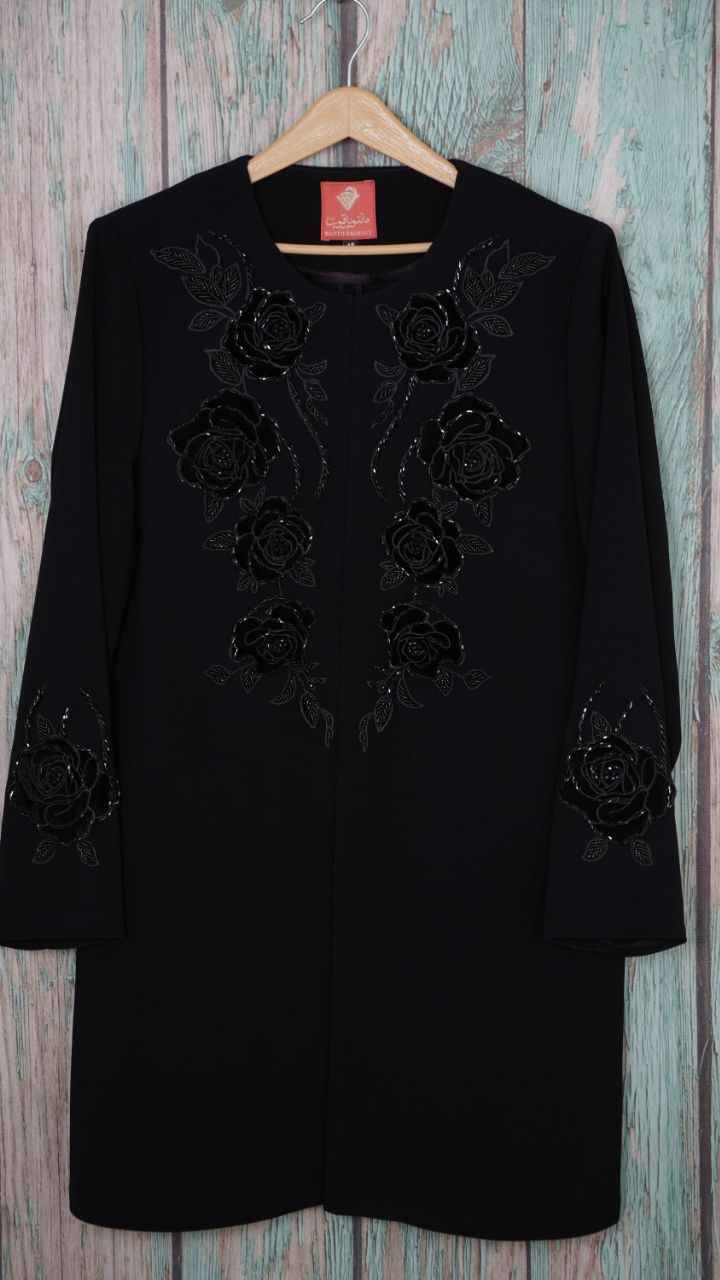 کت مدل گل روز مشکی پارچه کرپ اندونزی وارداتی درجه یک کیفیت روخت و پارچه تضمینی گل دوزی و جواهر دوزی شده