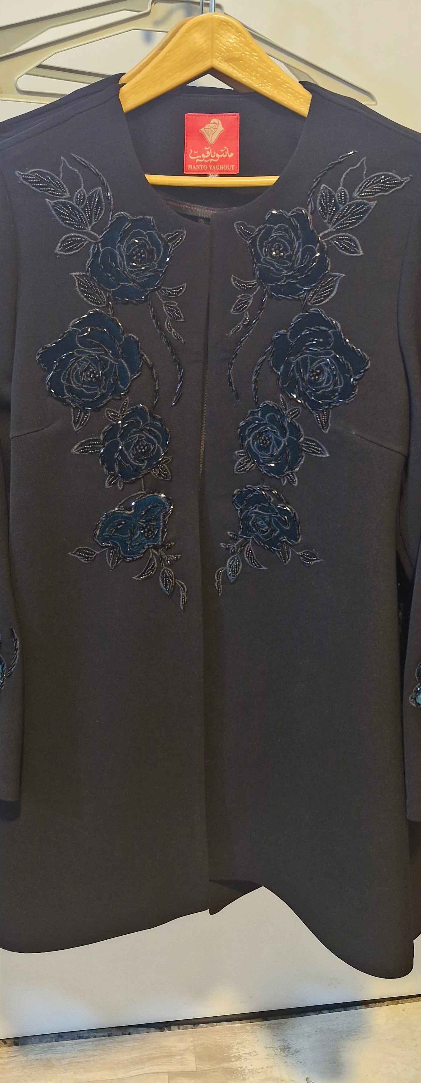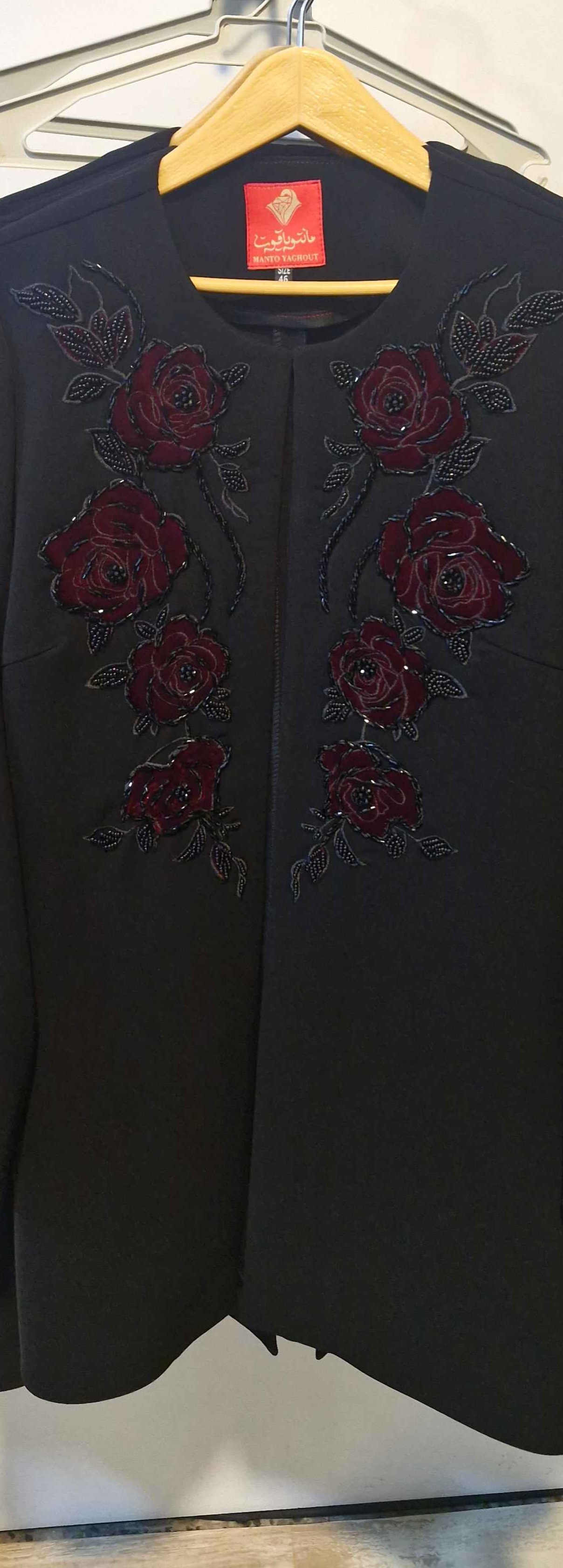 کت مدل گل روز مشکی پارچه کرپ اندونزی وارداتی درجه یک کیفیت روخت و پارچه تضمینی گل دوزی و جواهر دوزی شده